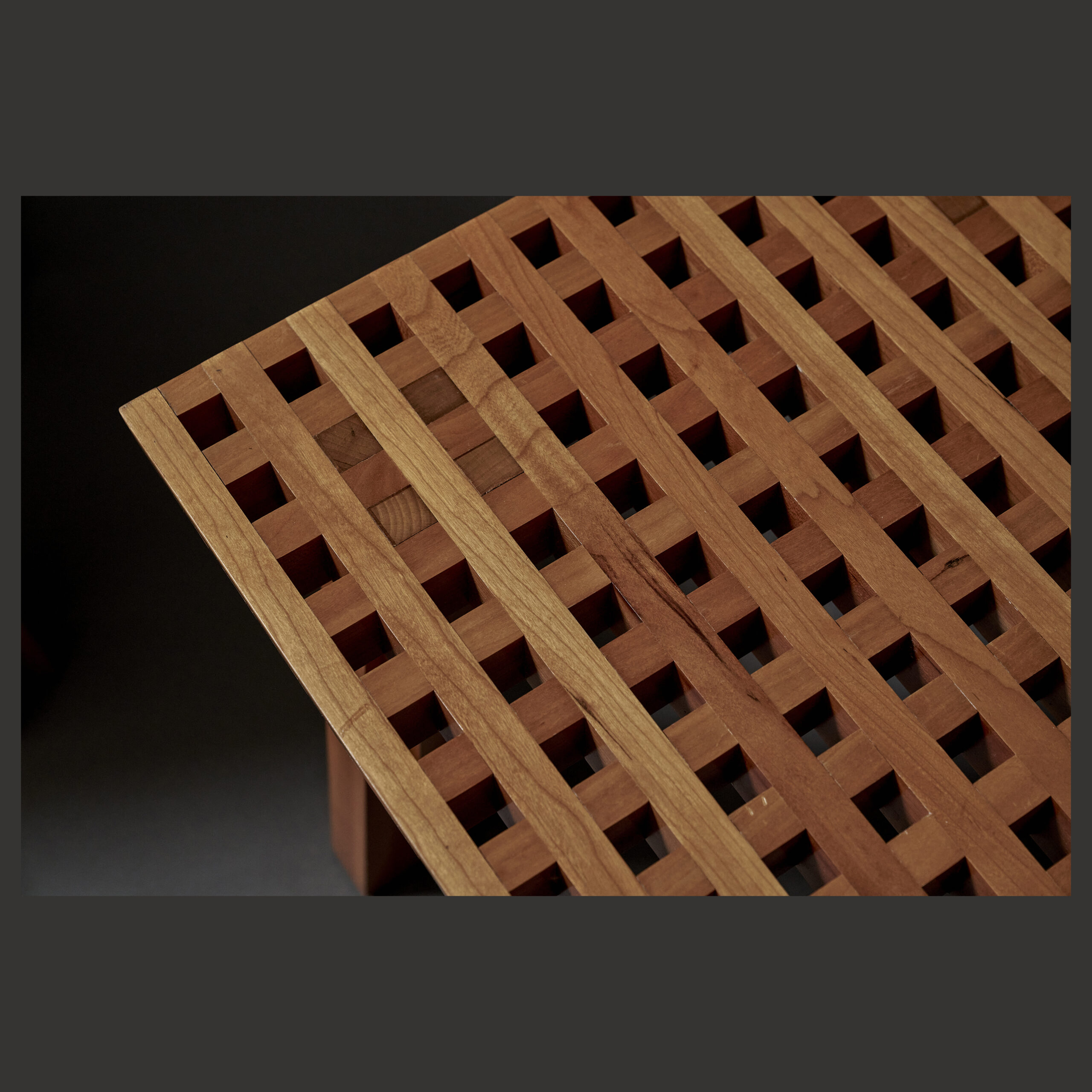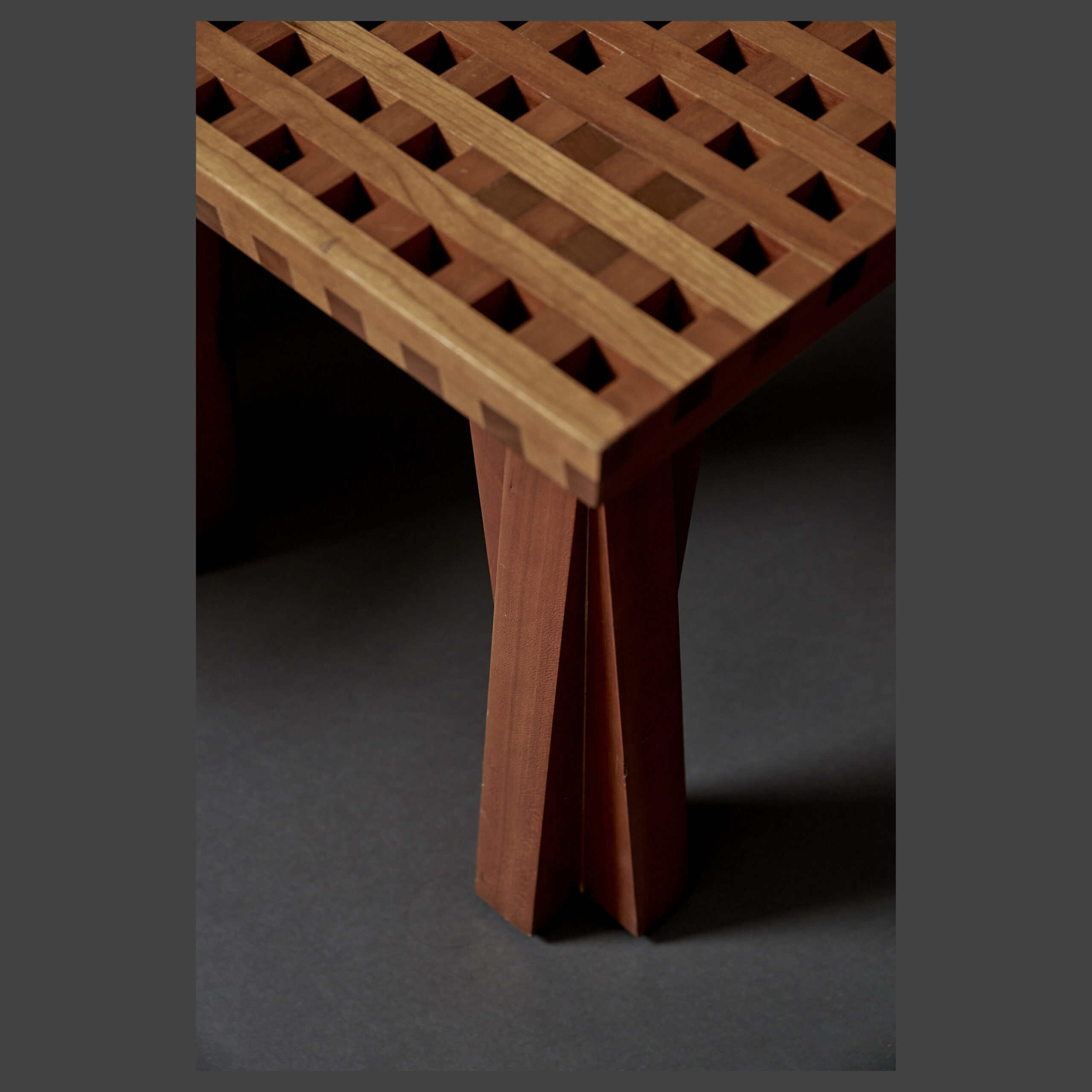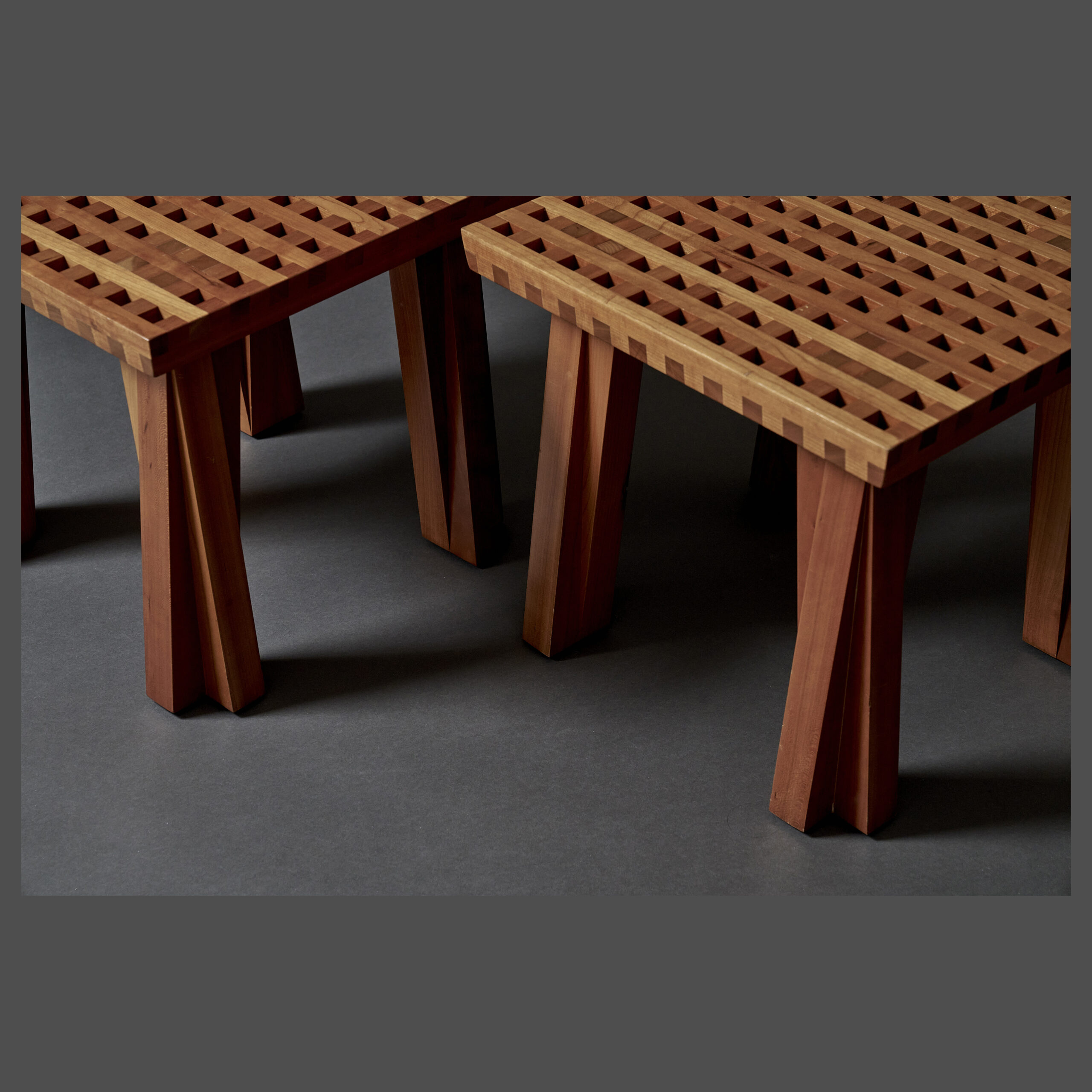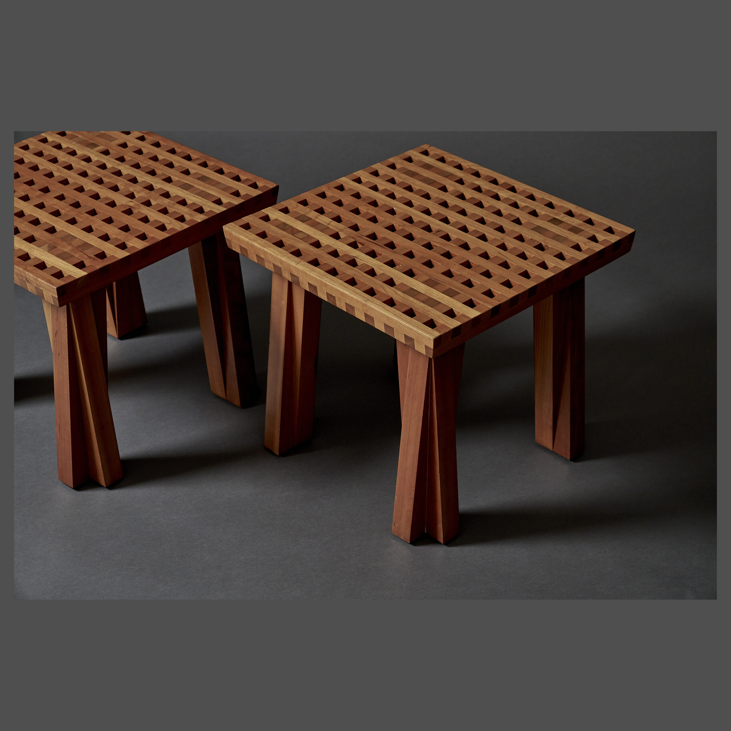 A pair of occasional or side tables executed in solid cherry with interlaid slats forming a ventilated top surface supported by four legs whose origami-like design appears poised for movement. The play of light and shadow provided by the open grid coupled with the playful leg construction conveys a visual lightness that softens the overall bold geometric profile. Precision crafted and physically substantial, the Japanesque style echoes that of Gianfranco Frattini’s Kyoto table. Branded to the top inside of each leg, “Bell Design”, they’re likely part of a small or experimental production run, though the artist is presently unknown to us. Late 20th century.