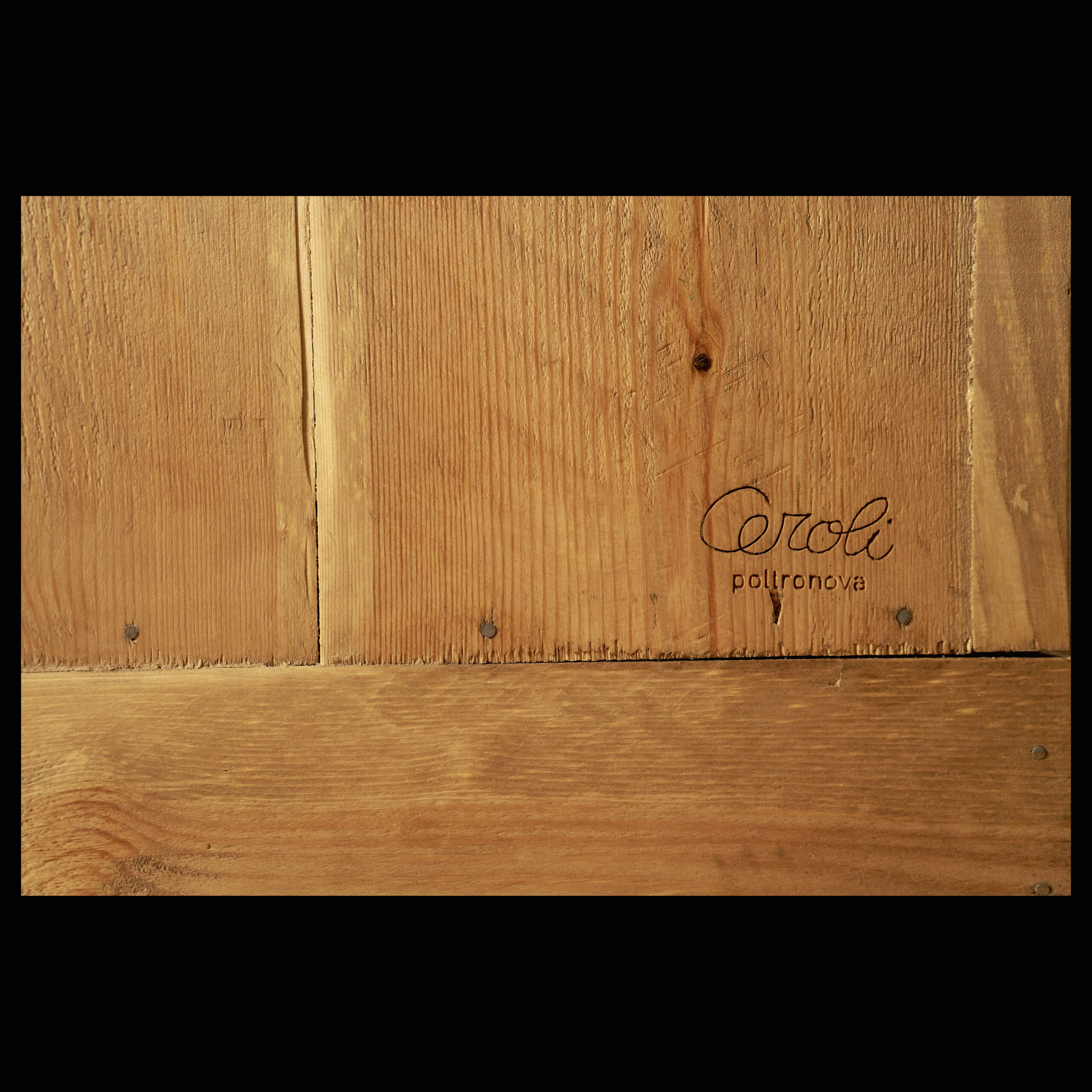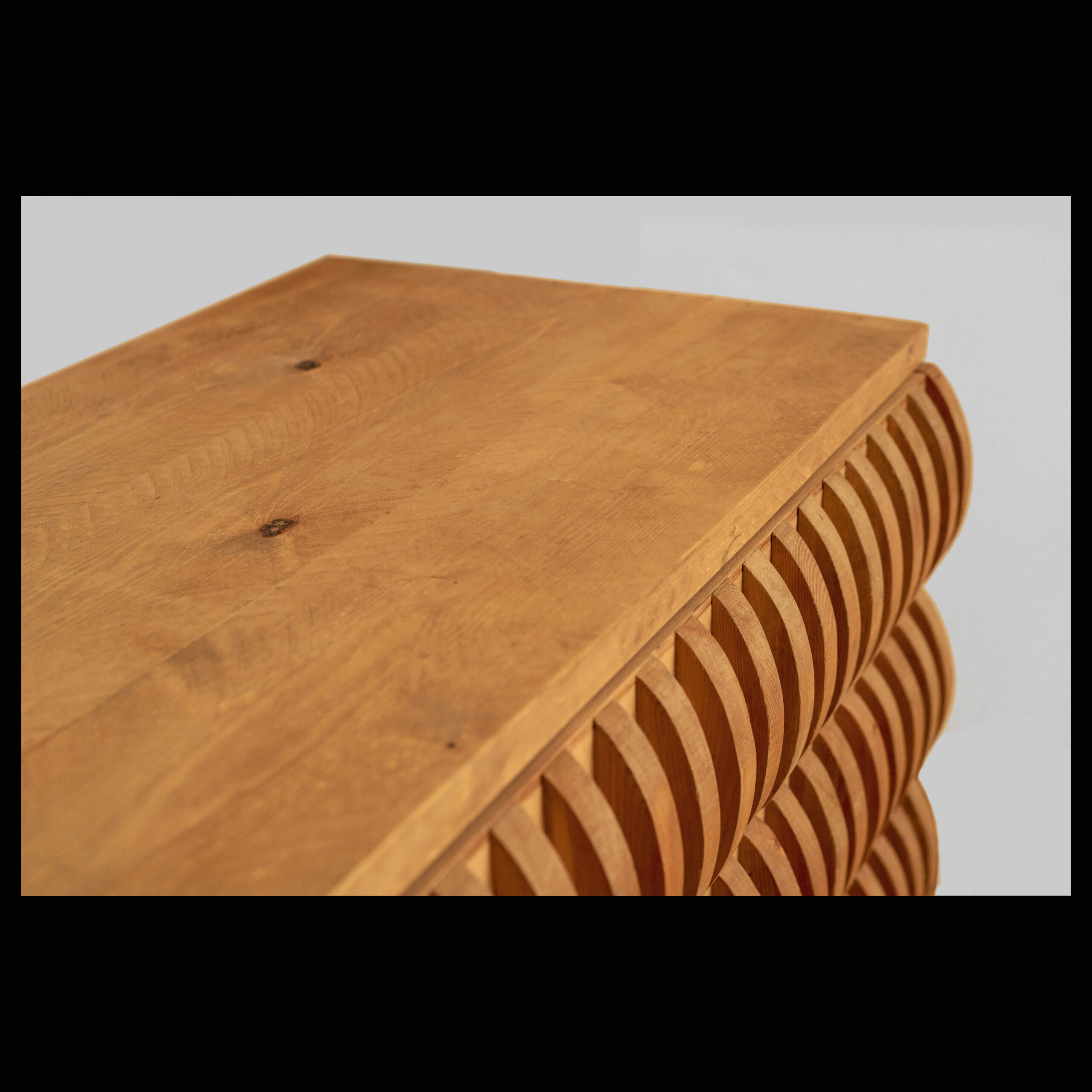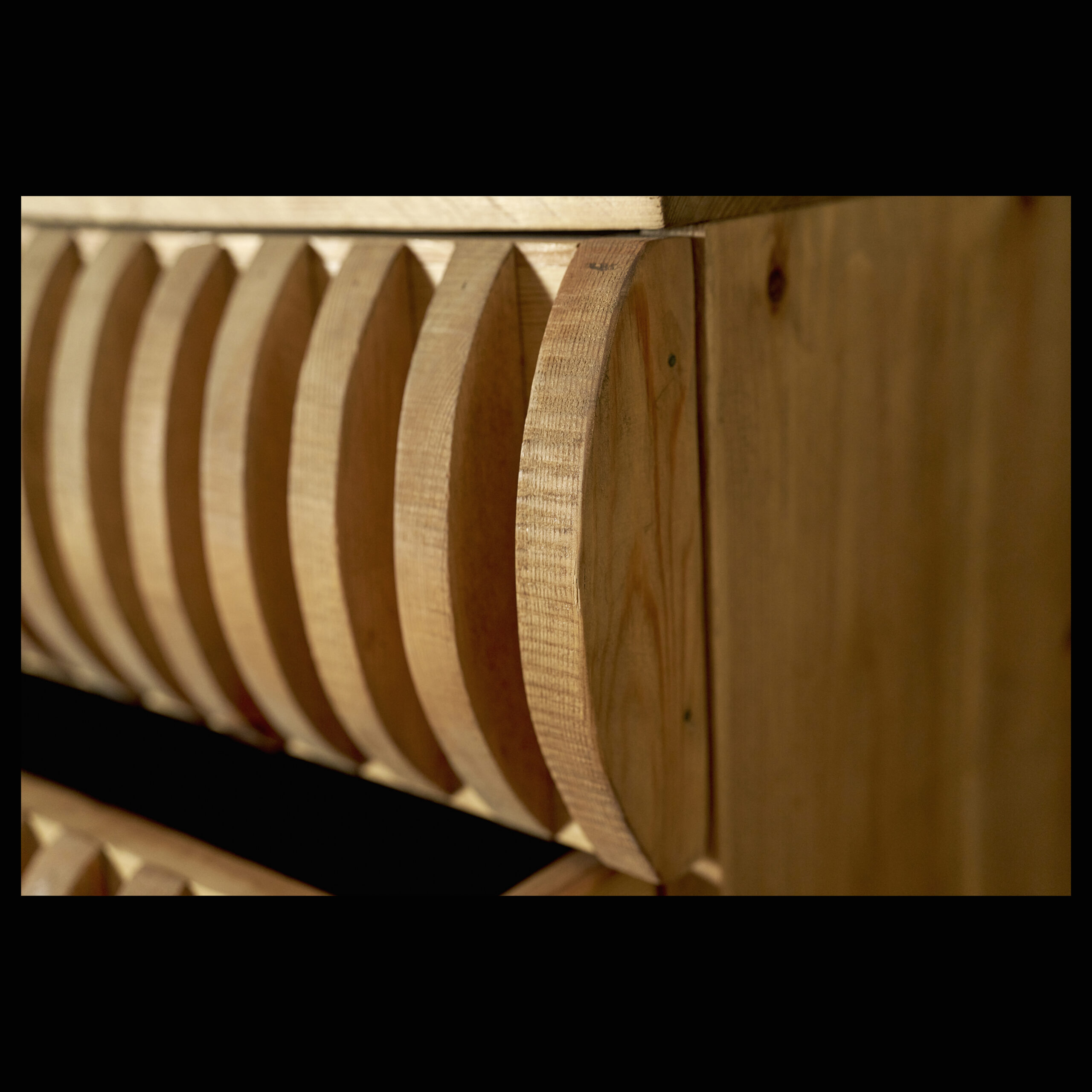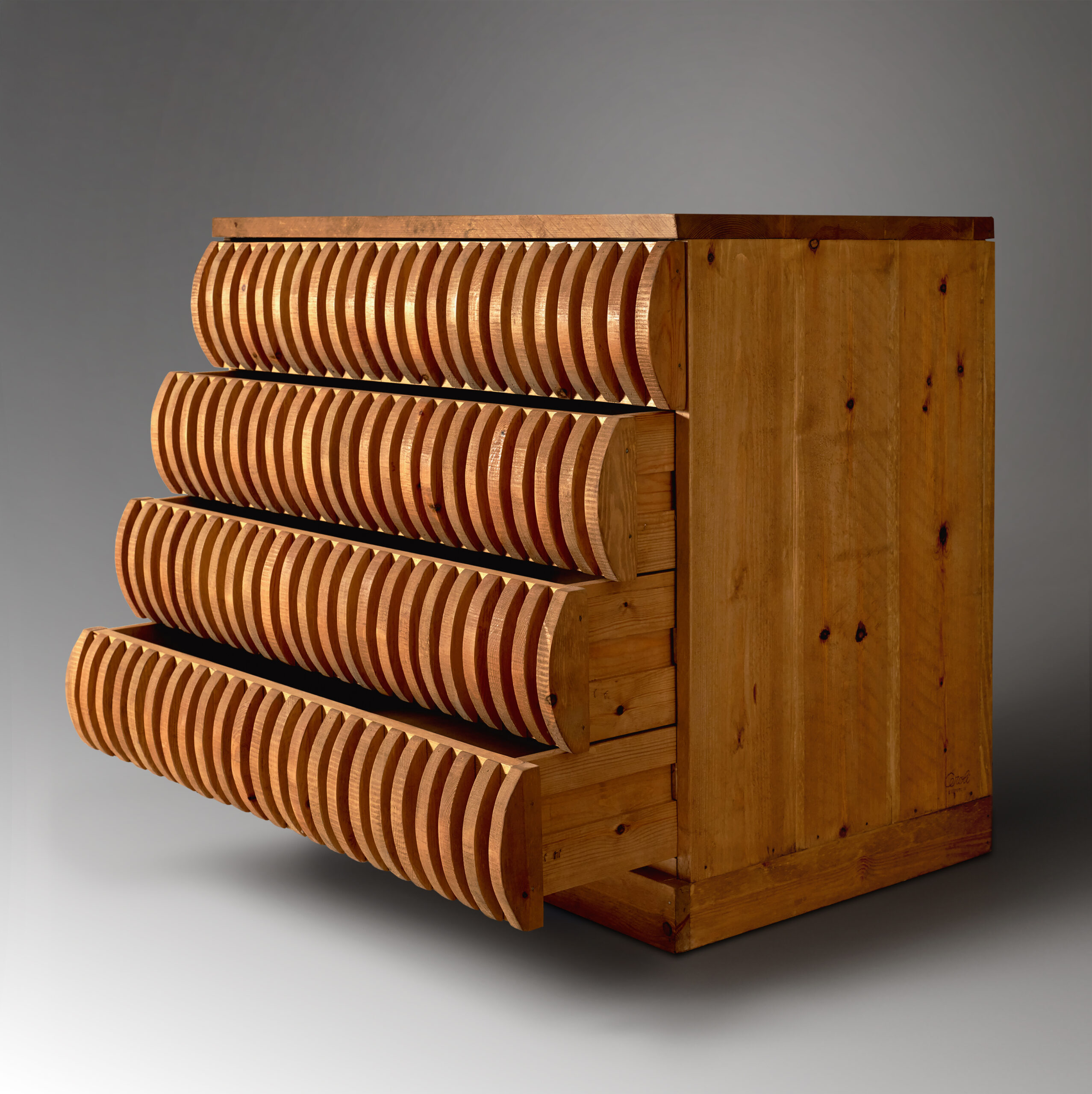 An exceptional, highly architectural chest of drawers constructed of solid, untreated Russian pine, with each of the four drawer fronts fitted with a repeating series of semicircular elements, designed by acclaimed Italian post-war artist and designer Mario Ceroli (b. 1938) and produced by Poltronova. Ceroli first began working with wood during the 1950s and would become influenced by the sculptural work of Louise Nevelson, which is certainly evidenced here. Part of his Mobili nella Valle collection (a tribute to the so named 1927 Giorgio de Chirico painting), this organic design ingeniously juxtaposes an unassuming material with a dynamic, rhythmic form, resulting in a work that’s at once understated and visually arresting, making it a particularly ideal choice for a foyer or entryway. A truly standout and hard-to-source case piece that will seamlessly integrate into both minimalist/modern and more eclectic/expressive interiors. Branded to side rear corner, ‘Ceroli Poltronova’. 1970s.