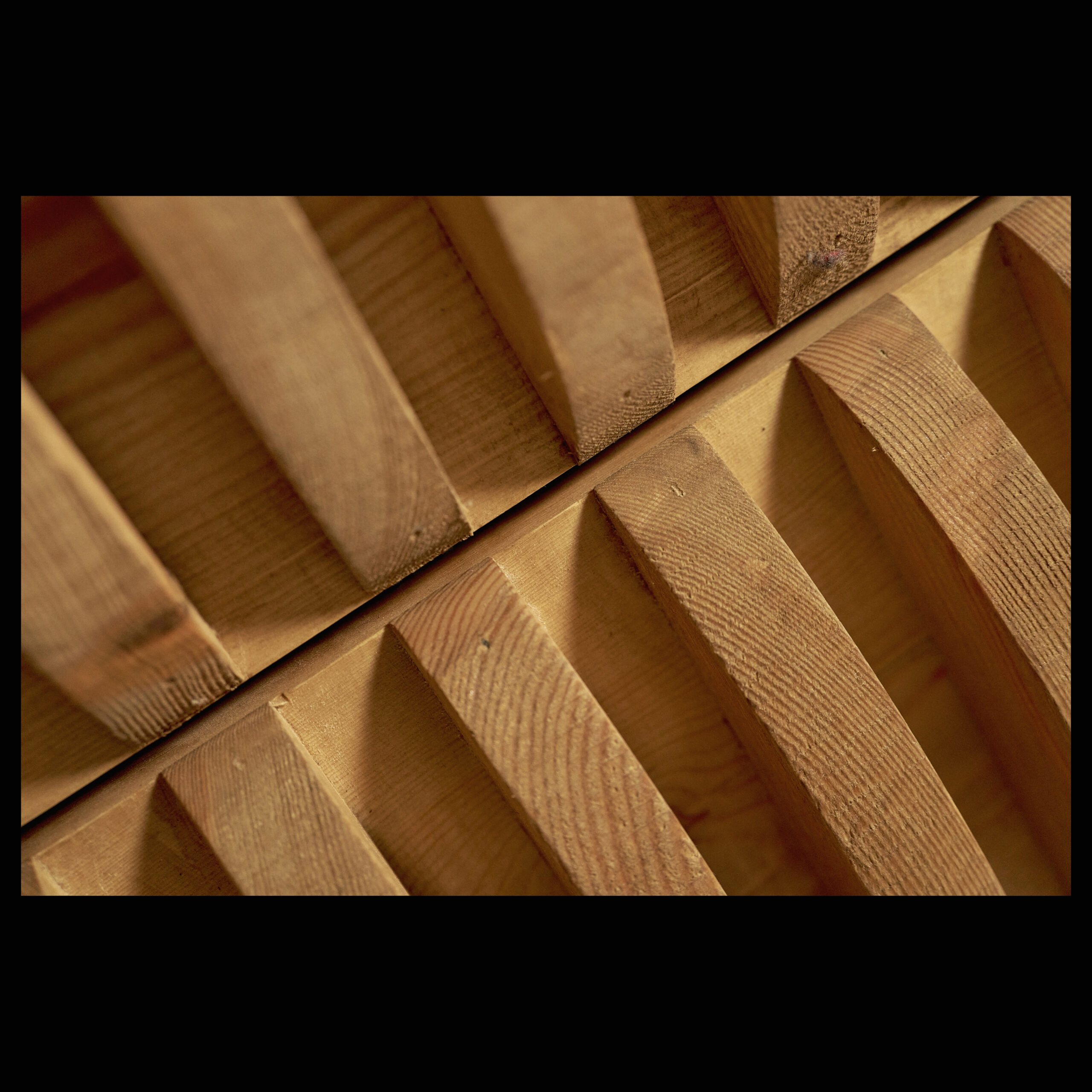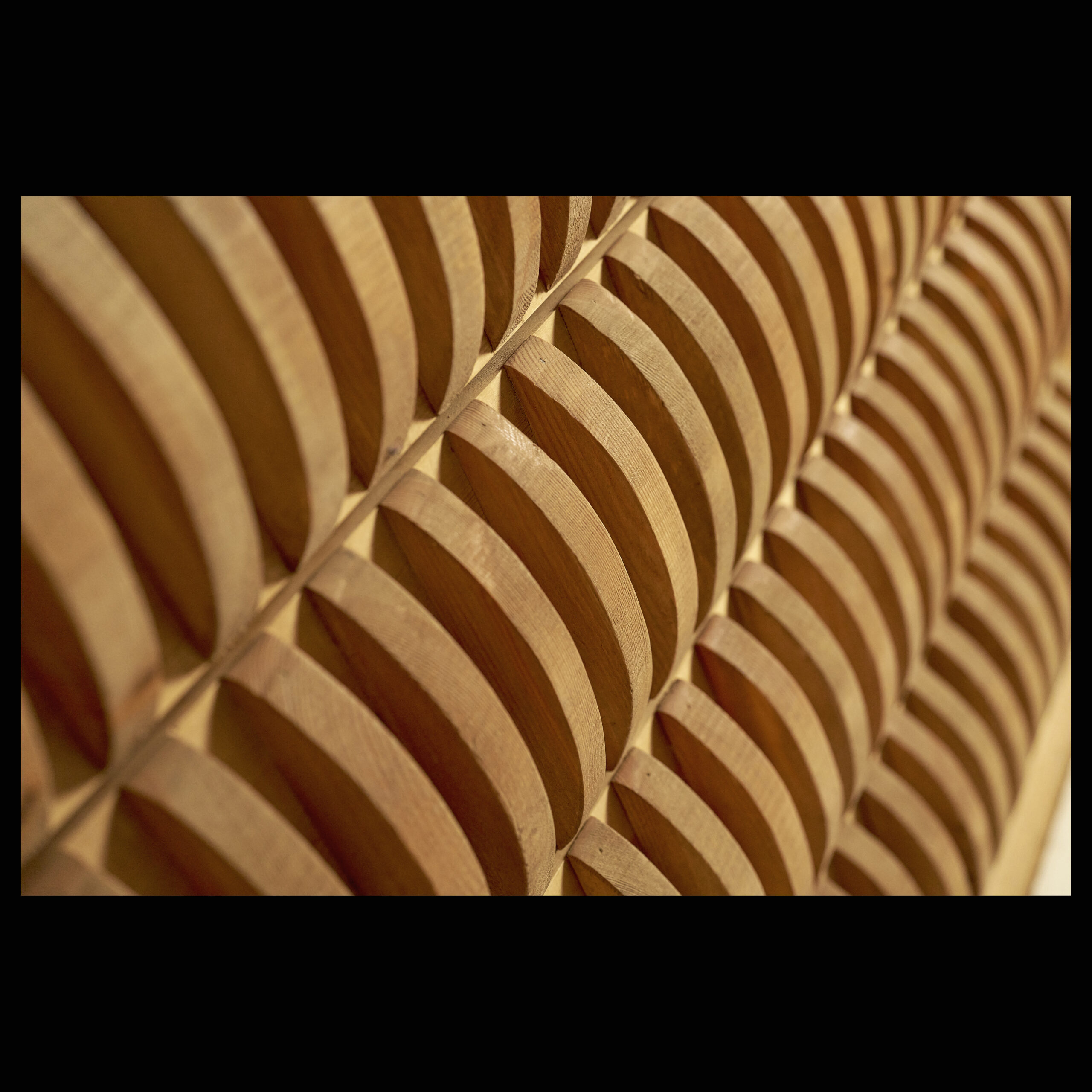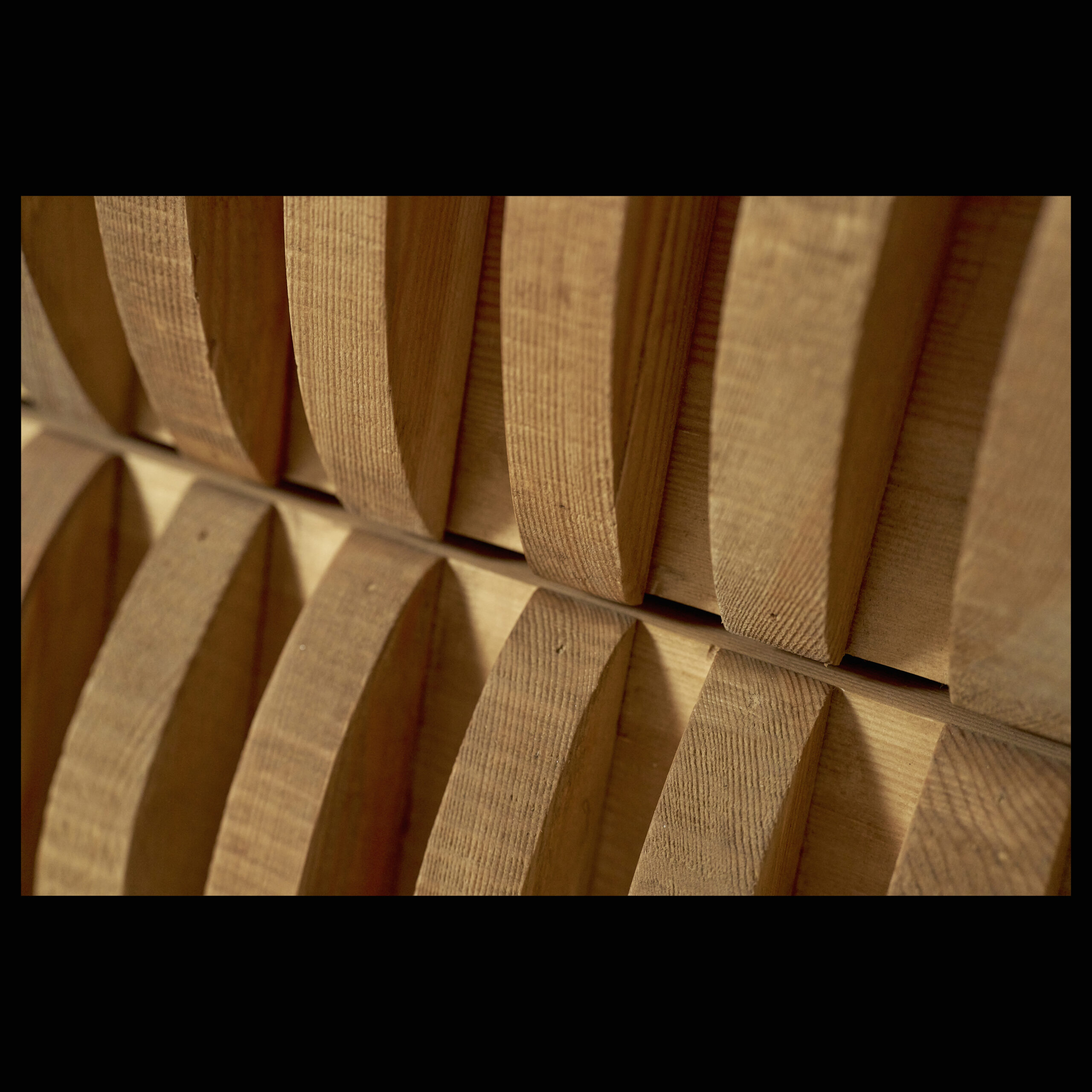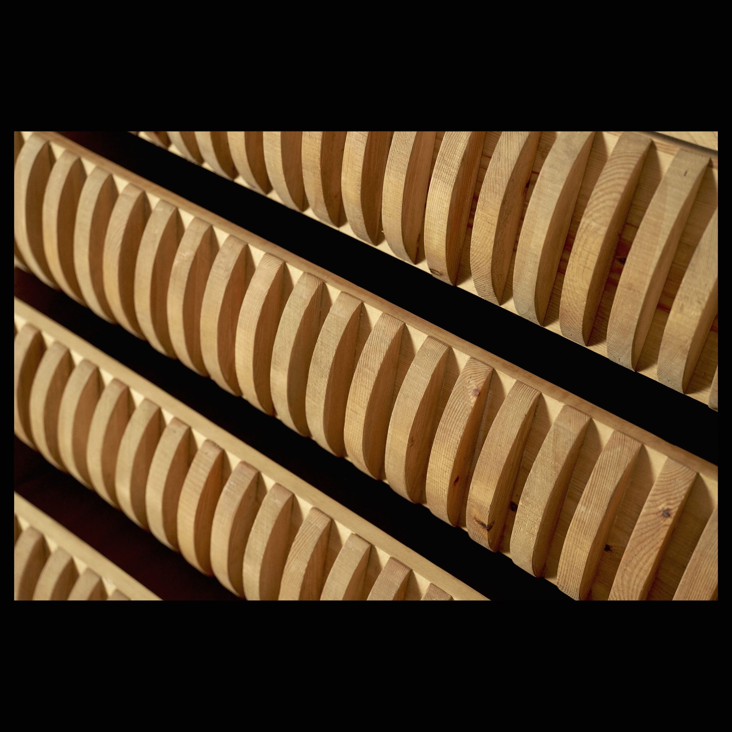 An exceptional, highly architectural chest of drawers constructed of solid, untreated Russian pine, with each of the four drawer fronts fitted with a repeating series of semicircular elements, designed by acclaimed Italian post-war artist and designer Mario Ceroli (b. 1938) and produced by Poltronova. Ceroli first began working with wood during the 1950s and would become influenced by the sculptural work of Louise Nevelson, which is certainly evidenced here. Part of his Mobili nella Valle collection (a tribute to the so named 1927 Giorgio de Chirico painting), this organic design ingeniously juxtaposes an unassuming material with a dynamic, rhythmic form, resulting in a work that’s at once understated and visually arresting, making it a particularly ideal choice for a foyer or entryway. A truly standout and hard-to-source case piece that will seamlessly integrate into both minimalist/modern and more eclectic/expressive interiors. Branded to side rear corner, ‘Ceroli Poltronova’. 1970s.